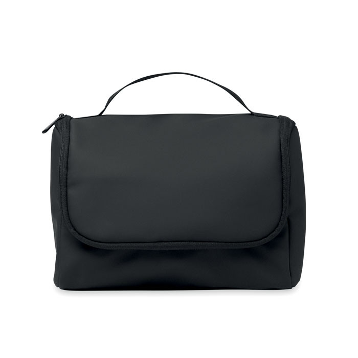 Kozmetikai rendszerező táska puha PU anyagból, akasztóval, 210D RPET béléssel. Egy nagy fő rekesz belső cipzáras hálós rekesszel és 1 hálós rekesszel.
