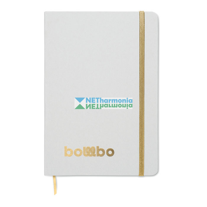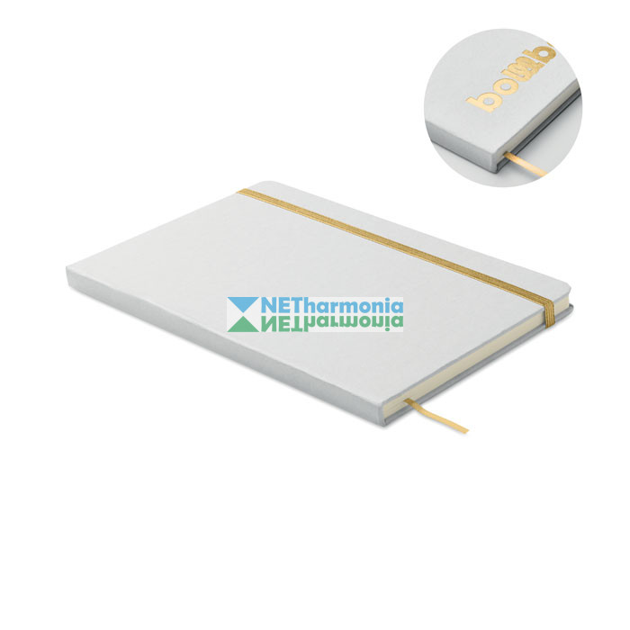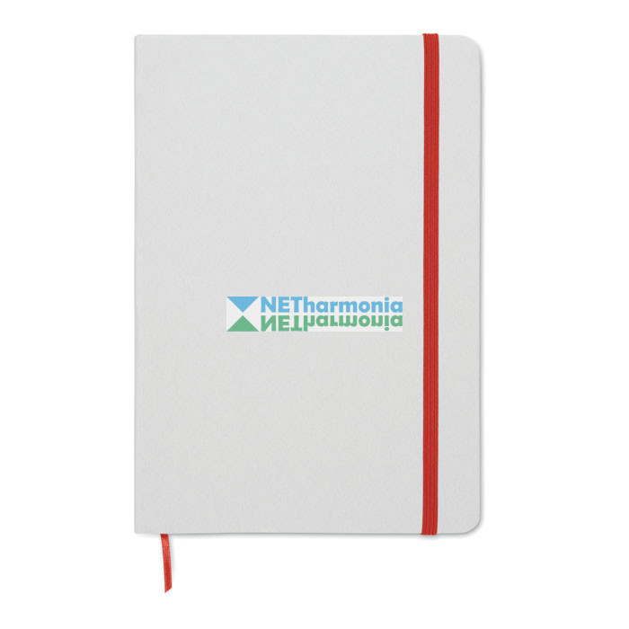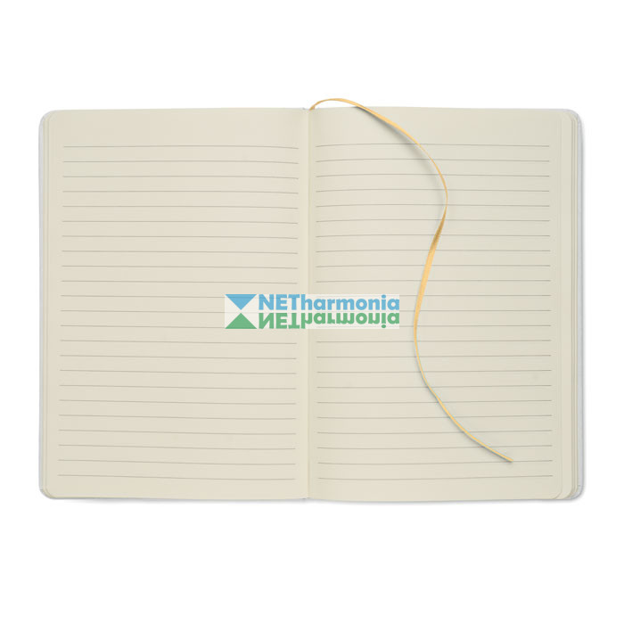 A5 keménytáblás jegyzetfüzet, 70%-ban újrahasznosított tejesdoboz csomagolásból és 30%-ban újrahasznosított papírból készült borítóval. Cérnafűzött. 160 vonalas oldal (80 lap) újrahasznosított papírból. Elasztikus zárópánt és könyvjelző szalag, melyek színe a gravírozás után, a fehér borító réteg alól megjelenő színhez illeszkedik.