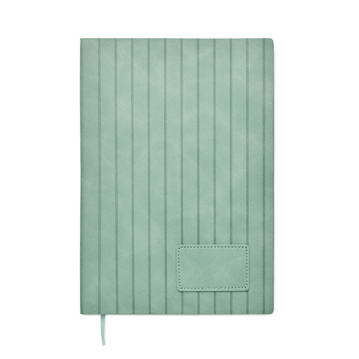 A5 jegyzetfüzet, füstös mintázatú, bordázott, 40% fogyasztás utáni újrahasznosított PU és 60% PU, puhafedeles borítóval, sima PU emblémázható címkével. 160 vonalas oldal (80 lap), 70 g/m² újrahasznosított papírból. Illeszkedő színű, poliészter könyvjelző szalag.