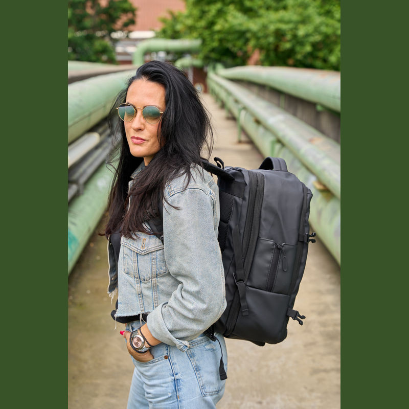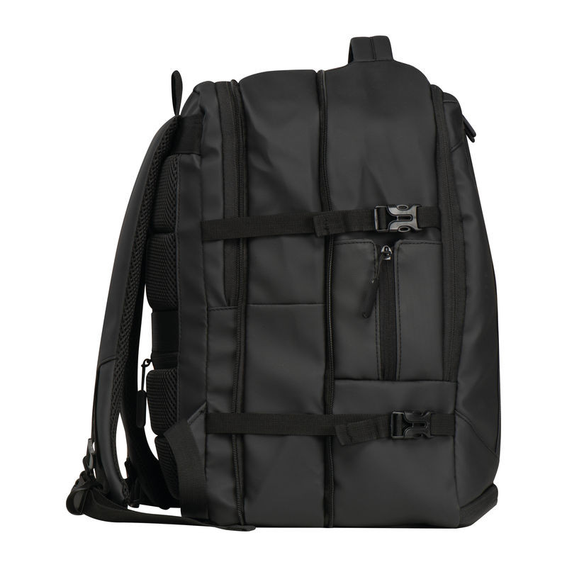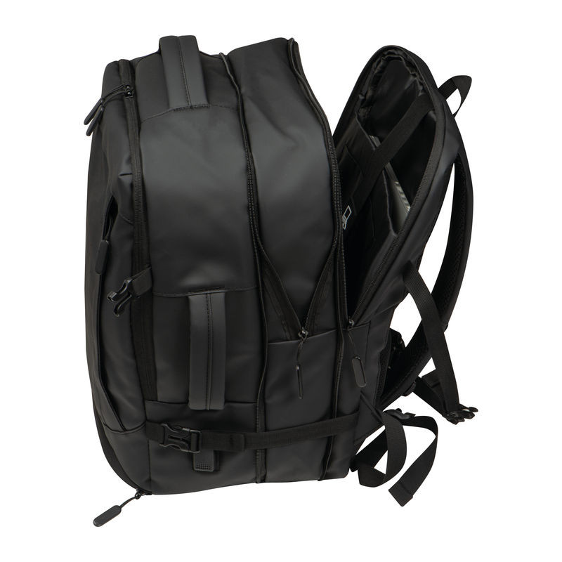 Kiváló minőségű bővíthető hátizsák 300D poliészterből. Ez a vízálló laptop hátizsák több rekesszel rendelkezik: egy zárható laptop tartó rekesszel és további cipzáros zsebekkel, egy biztonsági zsebbel hátul, egy oldalzsebbel hálós betéttel és bővíthető cipzárral, egy szennyesnek való rekesszel az alján, egy párnázott cipzáras zsebbel a táska elején, különböző praktikus belső zsebekkel. Ezen kívül tartalmaz egy USB-portot kábellel, két hordozófület, egy bőröndre rögzíthető pántot, párnázott vállpántokat, párnázott hátrészt és egy cipzárat a hátizsák bővítéséhez. Tökéletes társ nem csak üzleti utakra.