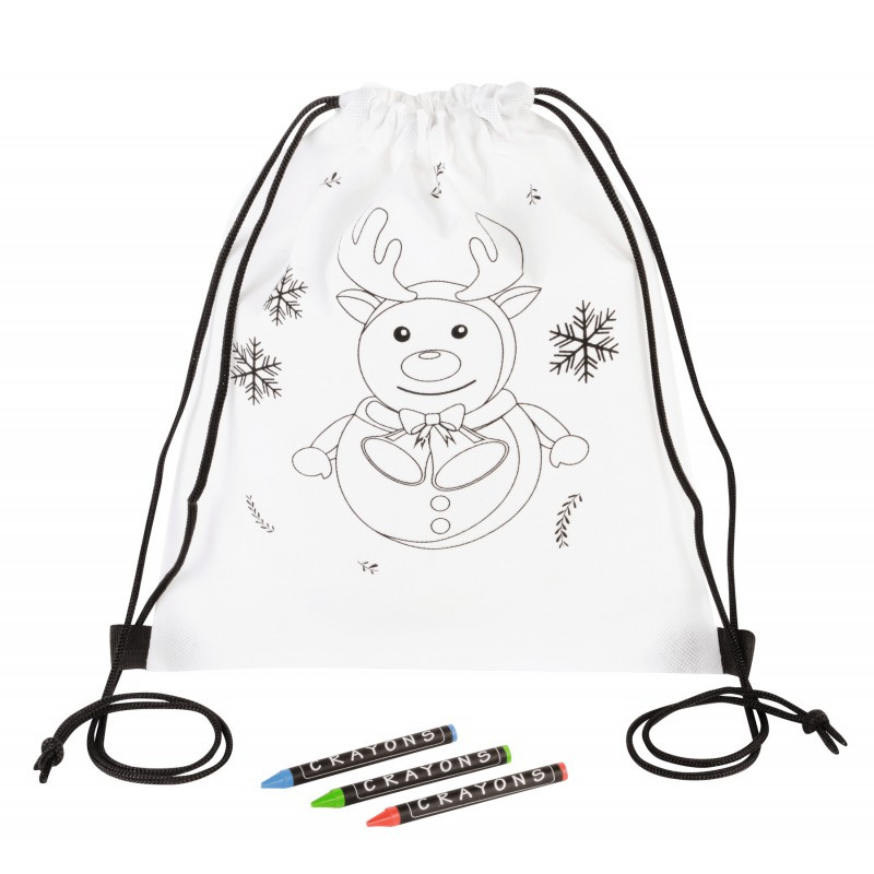 COLOURFUL ELK kiszínezhető zsinóros tornazsák: nyomtatott karácsonyi motívummal, 3 db viaszkrétával